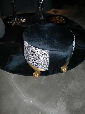 Pouff rund auf rundem Kuhfellteppich, 60 x 30 cm